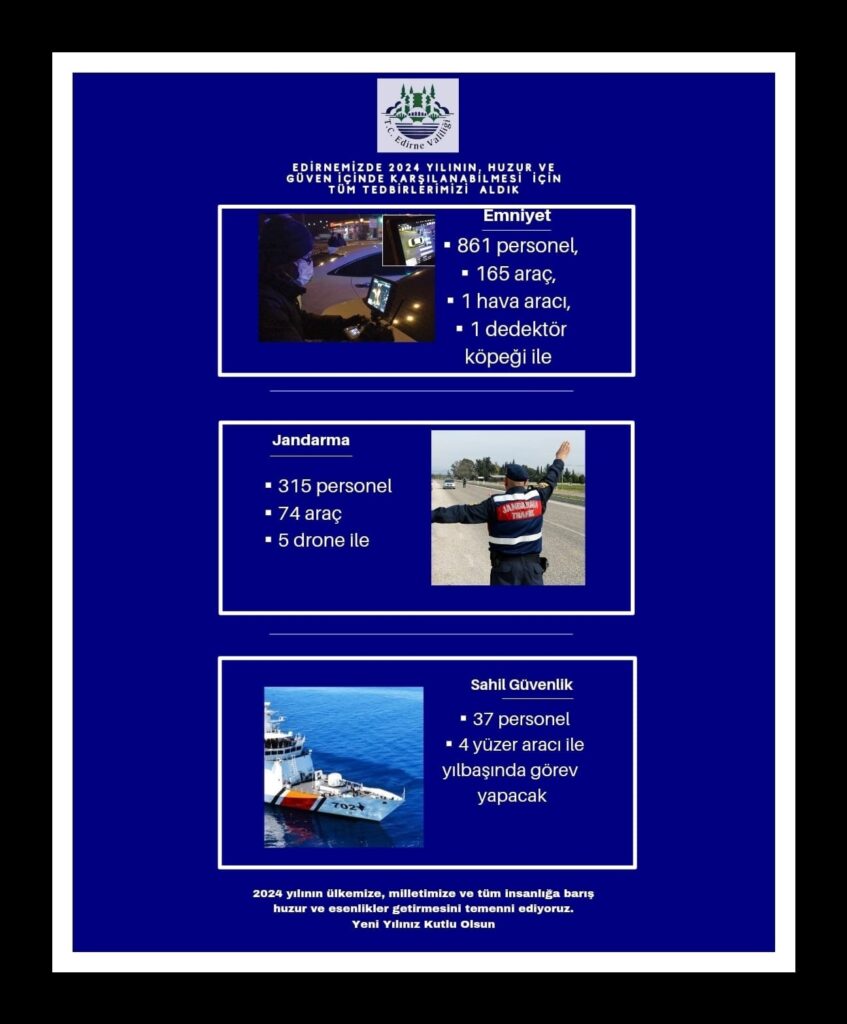 Edirne Valiliği, Edirne il genelinde yılbaşında jandarma, emniyet ve sahil güvenlikten 1213 güvenlik personelinin, huzur ve güvenliği sağlamak adına sahada görev yapacağını duyurdu.