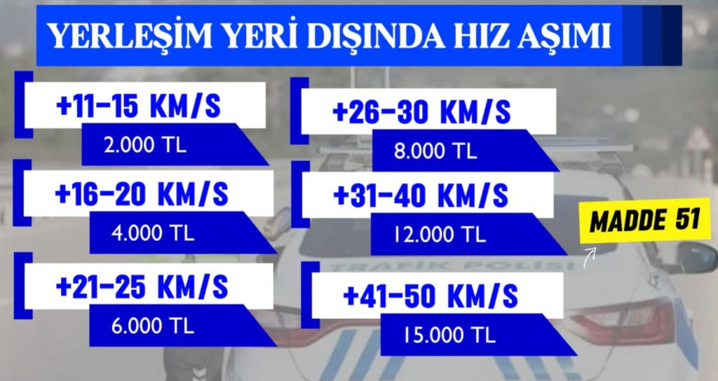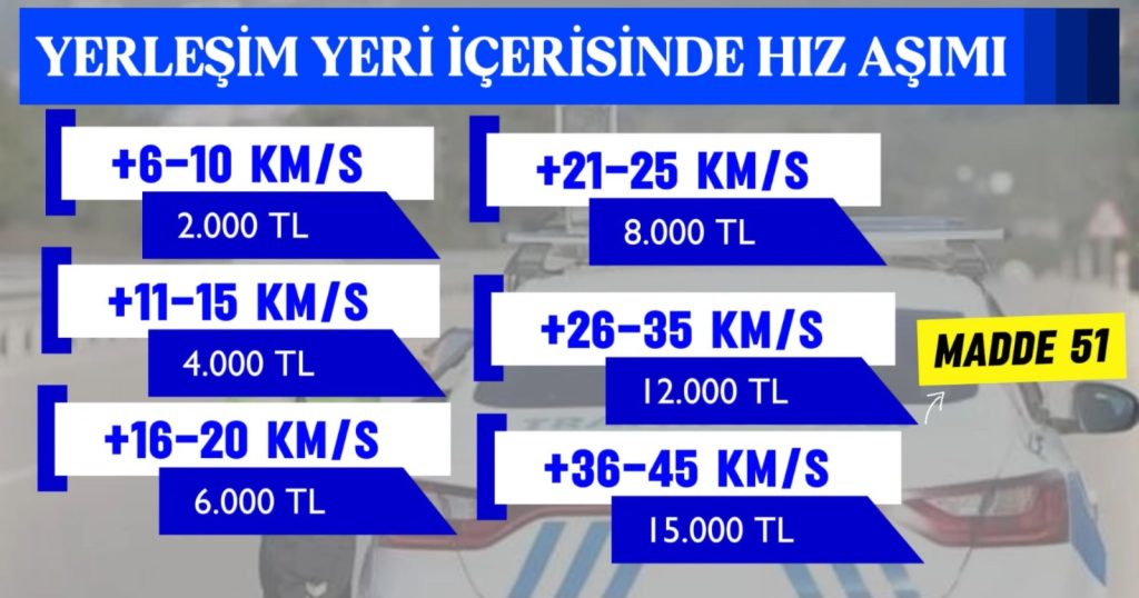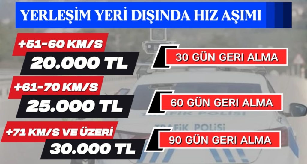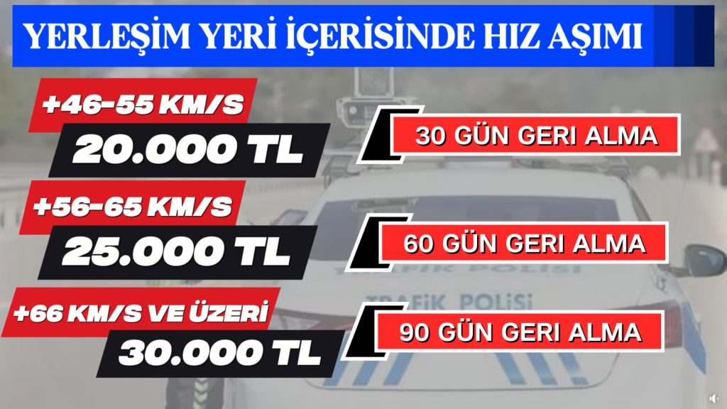 Öte yandan hız ihlalinin çok daha yüksek seviyelerde olması halinde yaptırımlar da ağırlaşıyor. Yerleşim yeri içerisinde hız sınırının 46 kilometre ve üzerinde aşılması durumunda sürücülere 20 bin TL’den başlayan para cezaları uygulanacağı, ayrıca sürücü belgelerine de belirli sürelerle el konulacağı bildirildi.