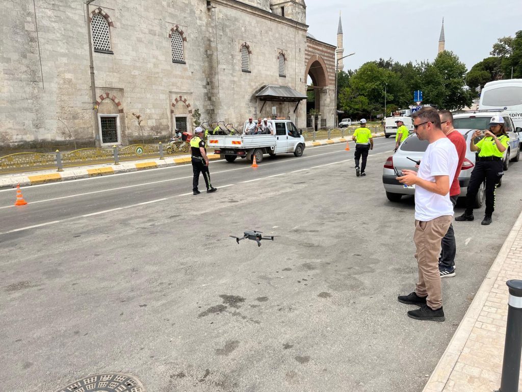 Kurban Bayramı tatili öncesi Edirne İl Emniyet Müdürlüğü Trafik Şube Müdürlüğü ekipleri tarafından Atatürk Bulvarı üzerinde denetim faaliyeti gerçekleştirildi. Dron yardımıyla gerçekleştirilen denetimde otomobil sürücülerine kemer, motosiklet sürücülerine de kask takmaları yönünde uyarıda bulunuldu. Trafik ekipleri, özellik bayram tatili öncesi hız ve trafik kurallarına uymaları konusunda sürücüleri uyardı.
