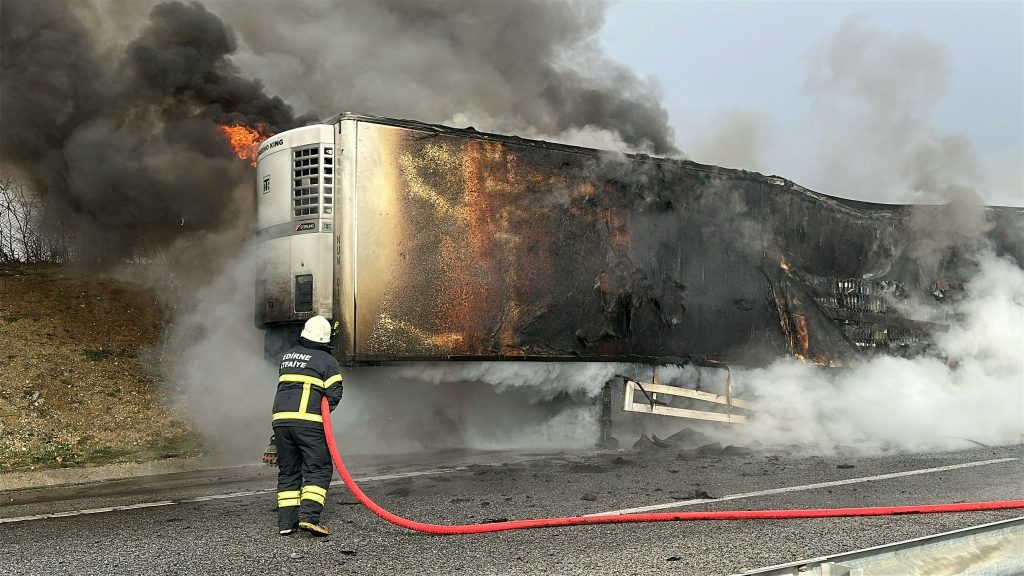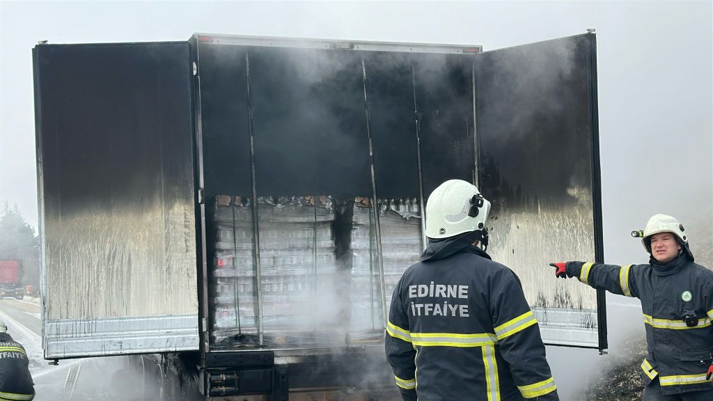 Edirne- Kapıkule yolunda Kapıkule istikametine giden Gürcistan plakalı ve limonata yüklü tırda yangın çıktı. Tırın dorsesinde çıkan yangında alevler yükseldi. Alevleri gören sürücü çekiciyi dorseden ayırıp uzaklaştırdı ve polis, sağlık ve itfaiye ekiplerinden yardım talep etti. Polis, sağlık ve itfaiye ekipleri olay yerine gelerek gerekli müdahalelerde bulundular. Çıkan yangın itfaiye ekiplerince söndürülürken, alev alev yanan dorse ise kullanılamaz hale geldi. Yaşanan olaydan dolayı kapatılan yol tekrar kullanıma açıldı. Yangının çıkış sebebi ise yetkililerce araştırılıyor. Haber Merkezi