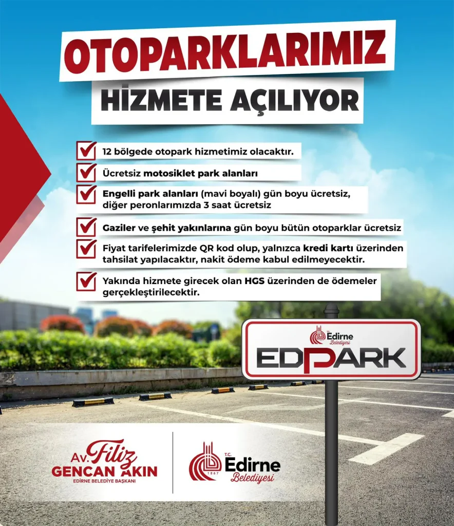 Şehit aileleri ve gazilerimiz, Edirne Belediyesi’ne bağlı tüm yol üstü ve açık otoparklardan gün boyu ücretsiz olarak faydalanabilecek.