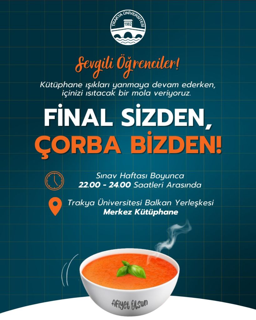 Trakya Üniversitesinden yapılan açıklamada; “Sevgili Öğrenciler, Sınav haftası boyunca çalışmalarınıza destek olmak amacıyla Balkan Yerleşkesi Merkez Kütüphanemizde 22.00 - 24.00 saatleri arasında çorba ikramımız olacaktır. Kütüphane ışıkları yanmaya devam ederken, içinizi ısıtacak bir molla veriyoruz. Final Sizden, çorba bizden. Tüm öğrencilerimize başarılar dileriz.” Haber Merkezi