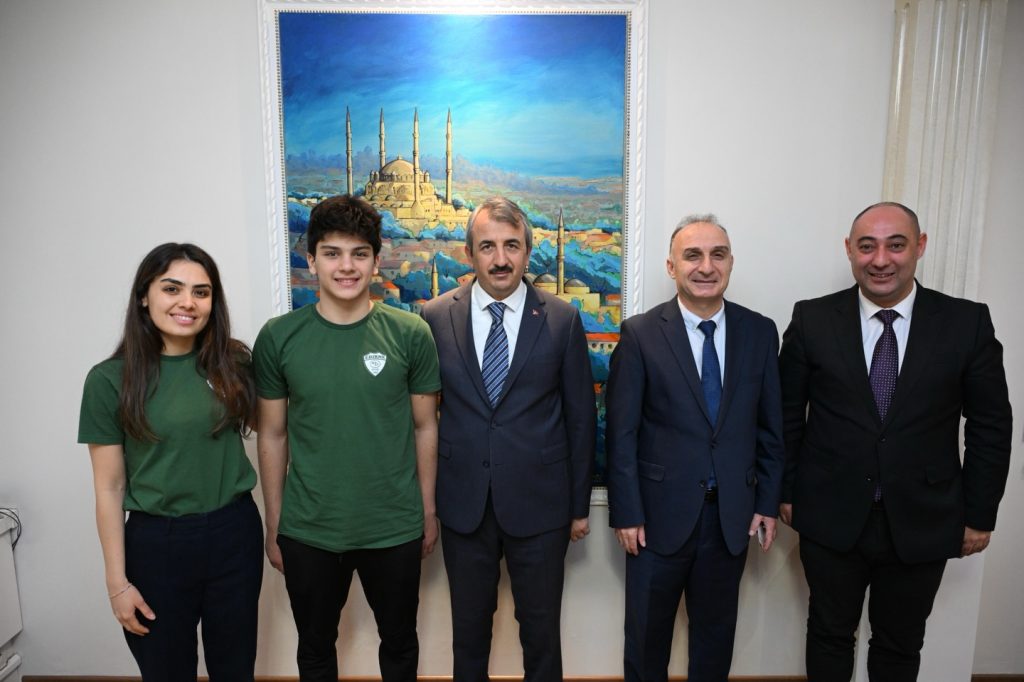 Türkiye Şampiyonu olan Edirne’nin gururu milli yüzücü Toprak Topatan, Gençlik Spor İl Müdürü Selim Ak ve beraberindeki heyet vali Yunus Sezer’i makamında ziyaret etti.