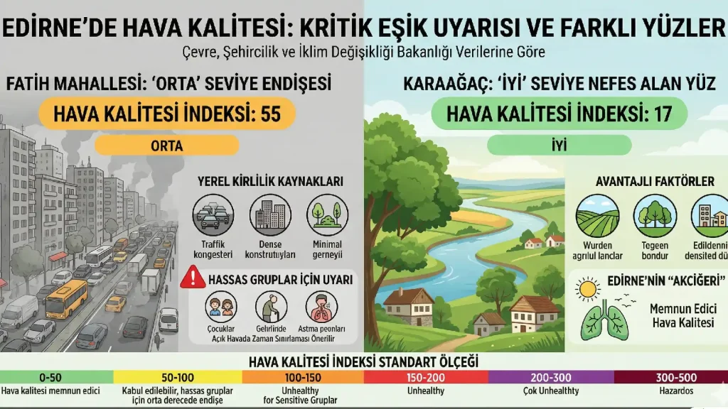 Edirne şehir merkezinde solunan havanın niteliği, son ölçümlerle birlikte yerel halkın ve çevre uzmanlarının odak noktası haline geldi. Çevre, Şehircilik ve İklim Değişikliği Bakanlığı tarafından paylaşılan güncel veriler, şehrin farklı noktalarında yaşayan vatandaşların birbirinden oldukça uzak standartlarda hava soluduğunu gözler önüne seriyor.