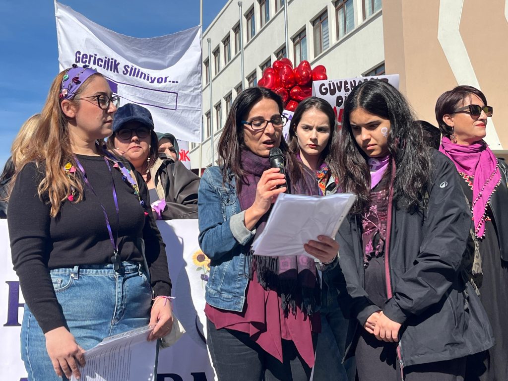 Haykır, yoksulluk nedeniyle kız çocuklarının eğitimden kopmasının arttığına dikkat çekerek, “Genç kadınlarda, eğitimde ve iş hayatında yer almayanların oranı oldukça yüksek. Üniversiteler, kampüsler kadınların özgürce bilime ulaşabileceği alanlar olmak yerine bilimsellikten uzak müfredatlarla, topluluklarla, tacizci akademisyenlerle kuşatılmıştır. Üniversiteli kadınların yaşam tarzlarına, kimliklerine karşı nefret politikaları devam ederken kampüslerde, yurtlarda failler cirit atıyor. Eğitim sistemindeki değişikliklerle laik, eşitlikçi ve bilimsel anlayış zayıflatılıyor, cinsiyetçi roller yeniden üretiliyor. Bu tabloyu kabul etmiyoruz. Yoksulluğa ve güvencesizliğe karşı eşit ve insanca çalışma koşulları, bilimsellikten uzak, tekçi eğitim anlayışına karşı laik, bilimsel ve demokratik eğitim hakkı için mücadele ediyoruz" dedi.