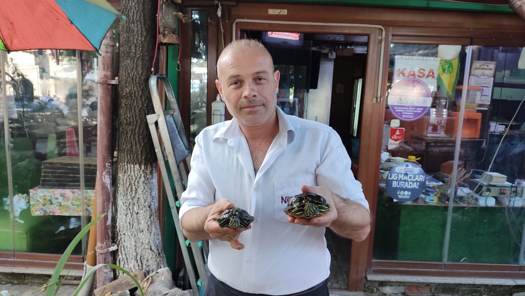 Edirne’de 30 yıla yakın bir süredir kafeterya işleten Kamil Tunca, işletmesinin bahçesinde bulunan havuzda 2 kaplumbağayla yaklaşık 15 yıl önce başladığı kaplumbağa bakımına, bugün 18 kaplumbağa ile devam ediyor. Bazı ailelerin evlerinde bakamadıkları kaplumbağaları da sahiplenen Tunca, onları ciğer ve özel yemler ile besliyor. Tunca; “Kendimiz bir iki taneyle başladık. Sonra evde bakılan kaplumbağalar var, insanlar tatile falan giderken evlerinde bakamadıkları için bizim buraya bırakmaya başladılar. Zamanla çoğalmaya başladılar” dedi.