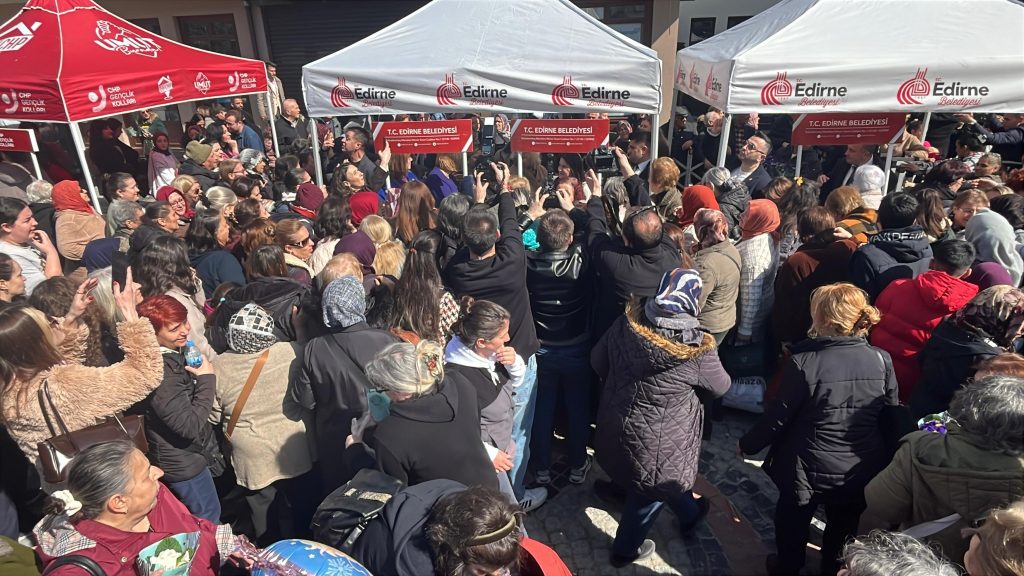 Edirne Belediyesi, 8 Mart Dünya Kadınlar Günü’nde Saraçlar Caddesi’nde kadınlara çiçek dağıttı; etkinliğe vatandaşların yoğun ilgisi izdihama yol açtı.