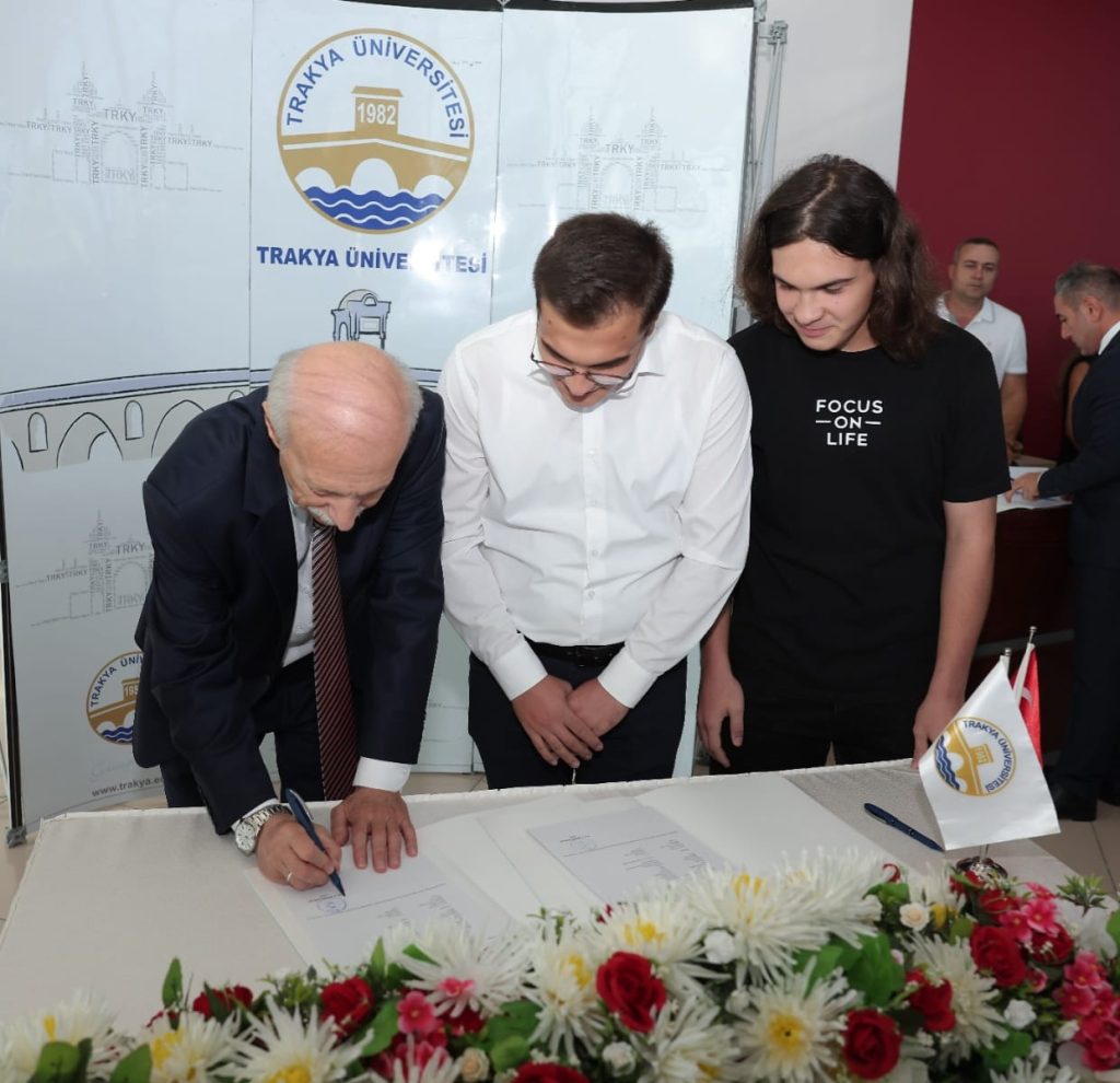Okulun ilk kaydını, geçtiğimiz günlerde Trakya Üniversitesi Rektörlüğü görevine atanan Prof. Dr. Mustafa Hatipler yaptı. Trakya Üniversitesi ile Edirne'yi bütünleştirici çalışmalar yapacaklarını belirten Rektör Hatipler; "İnovasyon çalışmalarıyla, gündelik hayatı etkileyici, Teknoparkla biraz daha haşır neşir olacağı, üniversitenin vakfının biraz daha aktif olacağı bir yeni dönem başlatıyoruz. Dolayısıyla 1'inci kademede üniversiteyle öğrencilerimizin kurumsal kimliğe sahip olma konusunda ciddi atılımlar atacağız. Sonra da üniversitemizle şehrimizi bütünleştirici çalışmalar yapacağız. Hayırlı uğurlu olsun" dedi.