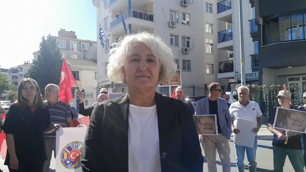 Katılımcılar Türk bayrağı ve ‘Mora katliamını unutmadık, unutturmayacağız’ yazılı pankartla Konsolosluğun önüne yürüdü ve kapısına siyah çelenk bıraktı. Damla GÖÇ AKYÜZ