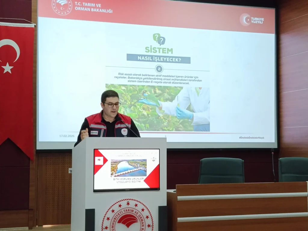 İl Müdürü İslam Köse yaptığı konuşmada, bitki koruma ürünlerinin rastgele değil, teknik kurallar ve mevzuat çerçevesinde kullanılması gerektiğini vurguladı. Köse, özellikle B-Reçete sisteminin üretimde kayıtlılık ve izlenebilirlik açısından büyük önem taşıdığını belirterek, bitki koruma ürünlerinin tedariğinde ‘eczane’ modeline geçileceğini kaydetti. Köse, “Konumuz bitki koruma ürünlerinin uygulanması ve denetimine ilişkin yönetmelik. Bu yönetmelik kapsamında karar alınan ve uygulamaya geçilen B-Reçete sistemi. Malumunuz 13 Aralık 2025 tarihinde bakanlığımız Bitki Koruma Ürünlerinin Uygulanması Ve Denetimine İlişkin Yönetmelik’te bazı düzenlemeler hayata geçirdi. Bitki koruma ürünlerini satışında, uygulamasında ve denetlenmesine ilişkin yeni düzenlemeler geldi. Bu kapsamda biz de sizlerle bugün buradayız. Bu yönetmelikle koruma ürünlerinin bilinçli, kontrollü ve doğru şekilde kullanılması, çevre ve insan sağlığının korunması, tarımsal üretimde sürdürülebilirliğin sağlanması aslında amaçlanıyor. Hepimiz için çok önemli bir durum. Bu kapsamda da yeni hayata geçirilen B-Reçete sistemiyle birlikte ürünler kayıt altına alınarak, reçeteli şekilde kullanılmasını sağlayan bir mekanizma karşımıza çıktı” dedi.