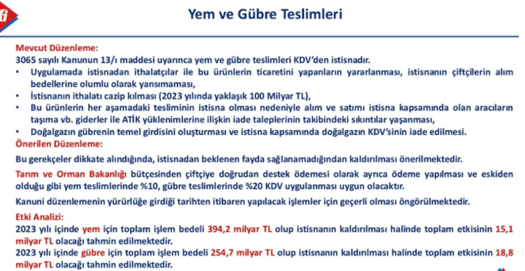 Böylece hayvansal üretimin en önemli girdisi olan yemdeki ve tarımsal üretimin en önemli girdilerinden biri olan gübredeki KDV çiftçiye yansıtılacak ve bu durumda çiftçinin maliyetlerini arttıracak.