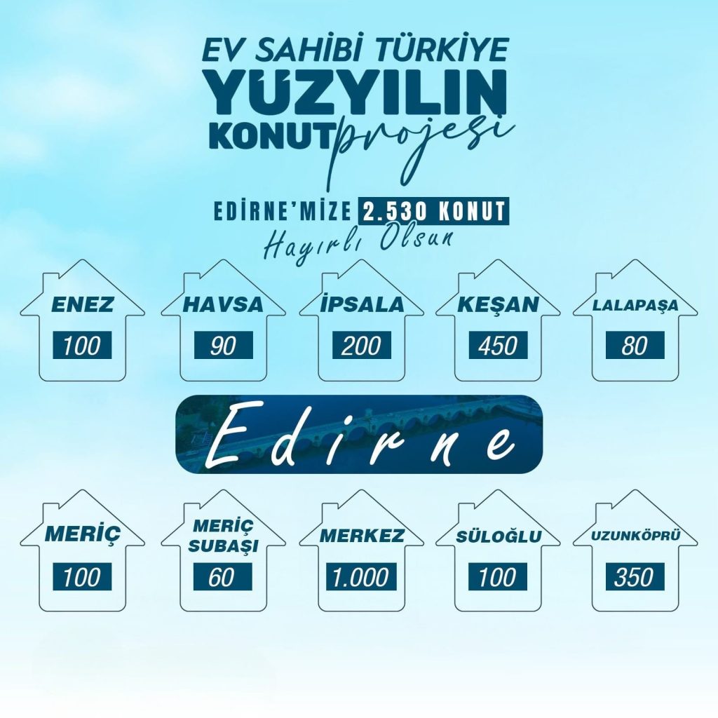 Proje kapsamında inşa edilecek evler 80, 65 ve 55 metrekarelik olacak. Dağılımı belli olan konutlara göre Edirne’de 2 bin 530 konut inşa edilecek.