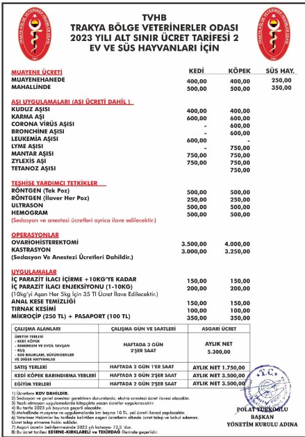 Trakya Bölge Veteriner Hekimler Odası tarafından yeni yıl öncesi, 2024 yılı ev ve süs hayvanları alt sınır veteriner ücretleri tarifesi açıklandı. Veteriner ücretlerine yüzde 40-50 arasında zam getirildi. Açıklanan yeni tarifeye göre kedi ve köpeklerde klinikte muayene 400 liradan 550 liraya, kuduz aşısı 400 liradan 600 liraya, karma aşı 600 liradan 900 liraya, tetanoz aşısı 750 liradan 1200 liraya yükseltildi. Kısırlaştırma operasyonu ücretleri ise erkek kedilerde 3 bin liradan 4 bin liraya, dişi kedilerde 3 bin 500 liradan 5 bin liraya, erkek köpeklerde 3 bin 250 liradan 4 bin 500 liraya, dişi köpeklerde 4 bin liradan 6 bin liraya yükseltildi. Parazit ilaçlarında ise iç parazit ilacı içirme 150 liradan 200 liraya, iç parazit ilacı enjeksiyonu ise 200 liradan 280 liraya yükseltildi. Mikroçip ve pasaport uygulaması ise 350 liradan 500 liraya yükseltildi.