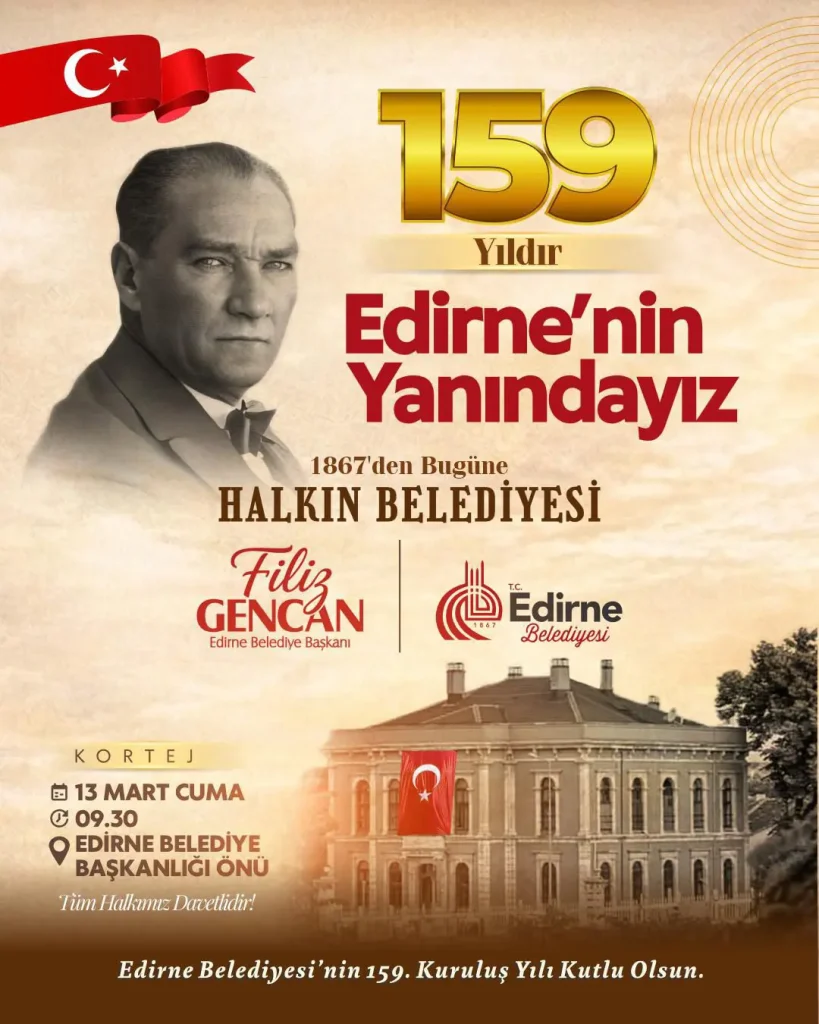 “Balkanlar’ın kapısı, Osmanlı’nın kadim payitahtı, Cumhuriyetimizin sarsılmaz kalesi Edirne’mizin hizmet yolculuğundaki 159. şeref yılını kutluyoruz. 1867 yılında Vali Hurşit Paşa döneminde ‘Daire-i Belediye’ adıyla dikilen o ilk fidan, bugün asırlık bir çınar haline gelmiş; dallarıyla bu şehrin her bir sokağını, her bir hanesini kucaklamıştır.