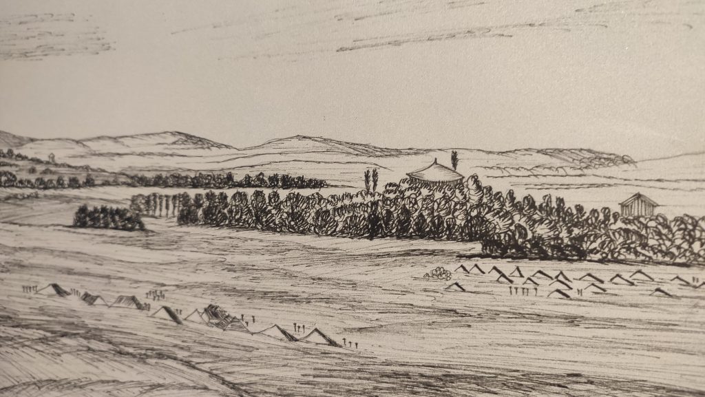 Öğrencisi Füsun Yılmaz’ın eseri hakkında konuşan Öğr. Gör. Bayatlı; “Görsel Edirne’yi gösteriyor. Bugün Eski TOKİ’ye giden yolun olduğu bölgeyi gösteriyor. Acı Çeşme Mezarlığı’nın açık halini gösteriyor. Bu görsel arşivden yeni çıktı. Burada Edirne Sarayı’nın Cihannüması görünüyor. Bu gravürün en önemli noktası, Osmanlı ordusunun konuşlandığı yeri göstermesidir. Eserde görseli çizenler de var. Hangi noktadan bakarak gravürü yaptıklarını gösteriyorlar. Öğrencimiz, gravürü güncelleyerek düzgün bir hale getirdi. Sarayı koruyan bostancılar, bu alanda konuşlanıyorlarmış. Şu anda eserde payitahtın burada olduğu ve askerlerin korumaya aldığı belli oluyor. Muhteşem bir sahne. Şu anda ayçiçeği tarlalarının bulunduğu alan, o dönemde bostancıbaşıların konuşlandığı, sarayı korudukları alanmış. Mezarlığın da orijinal hali ortaya çıktı. Ayrıca yapılarda Selimiye Camii de var. Günümüze güncellenen eseri öğrencimiz Füsun Yılmaz yaptı. Eserin orijinali, Edirne’nin 1740 yılındaki halini gösteriyor” diye konuştu.