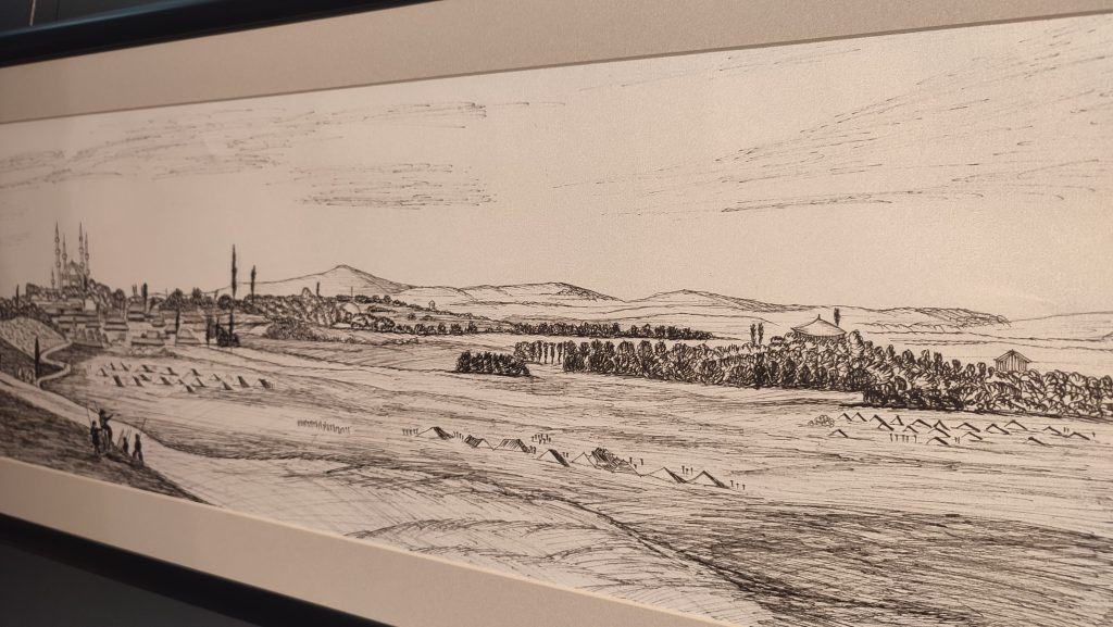 Bayatlı, öğrencisi Füsun Yılmaz’ın eseri kara kalem sanatıyla günümüze uyarladığını belirterek, tarihçilerce merak edilen Edirne Sarayı’nın nasıl korunduğuna ve askerlerin saray etrafında nasıl konuşlandığına açıklık getirdiğine dikkat çekti.