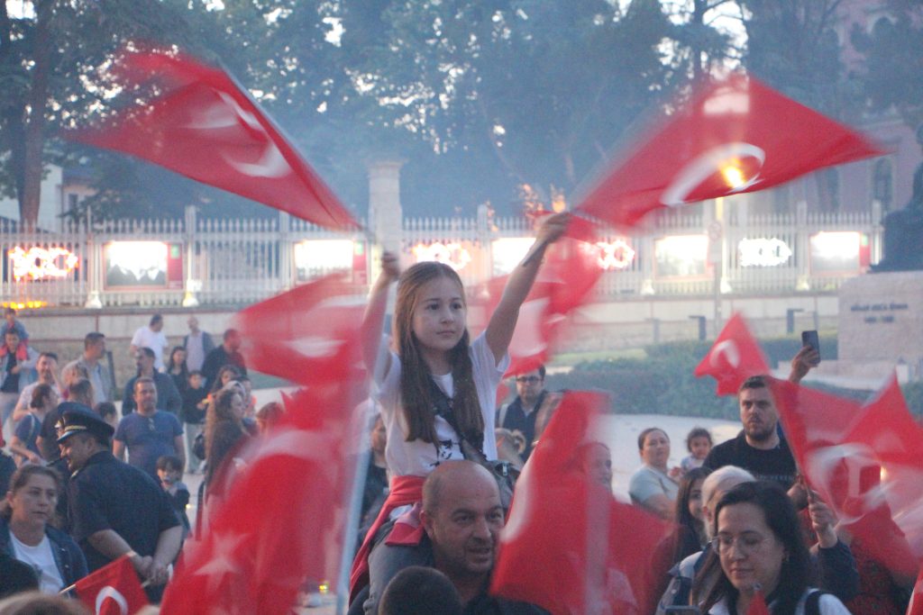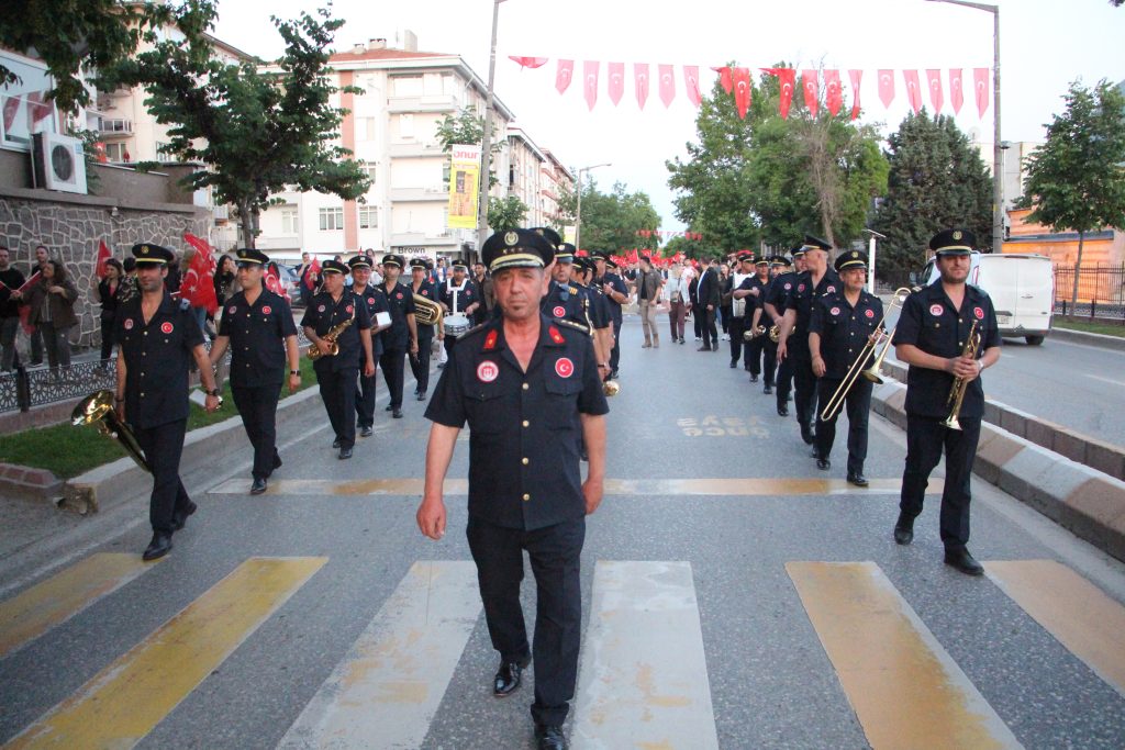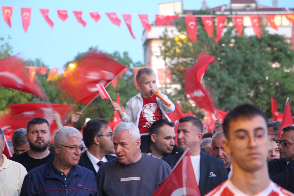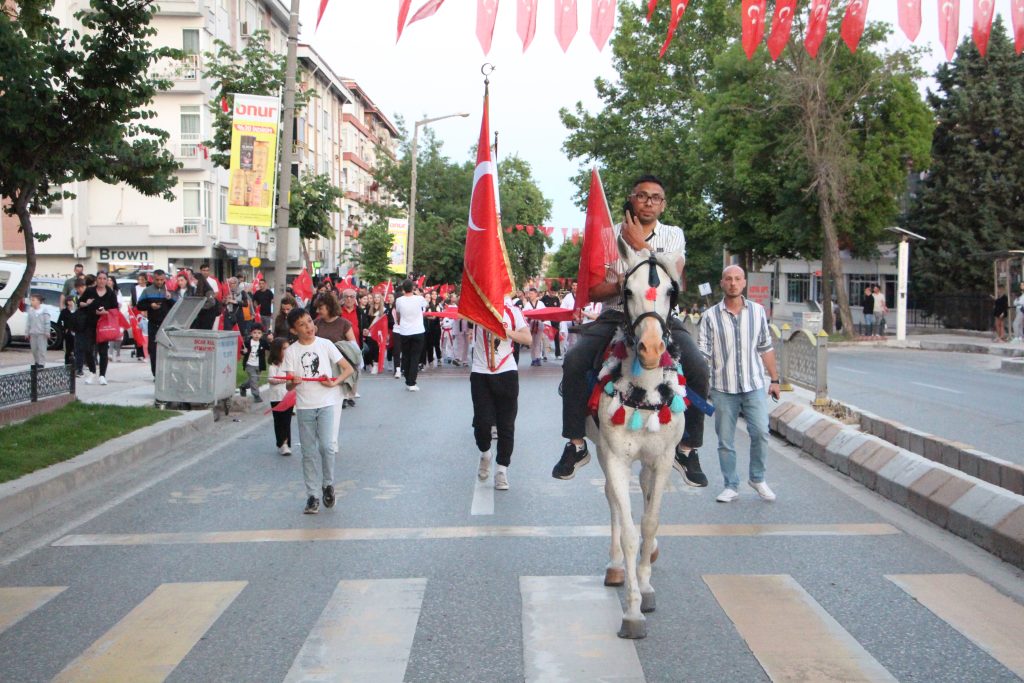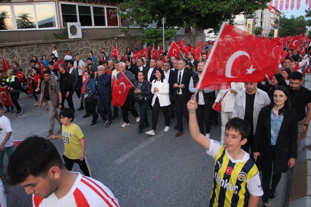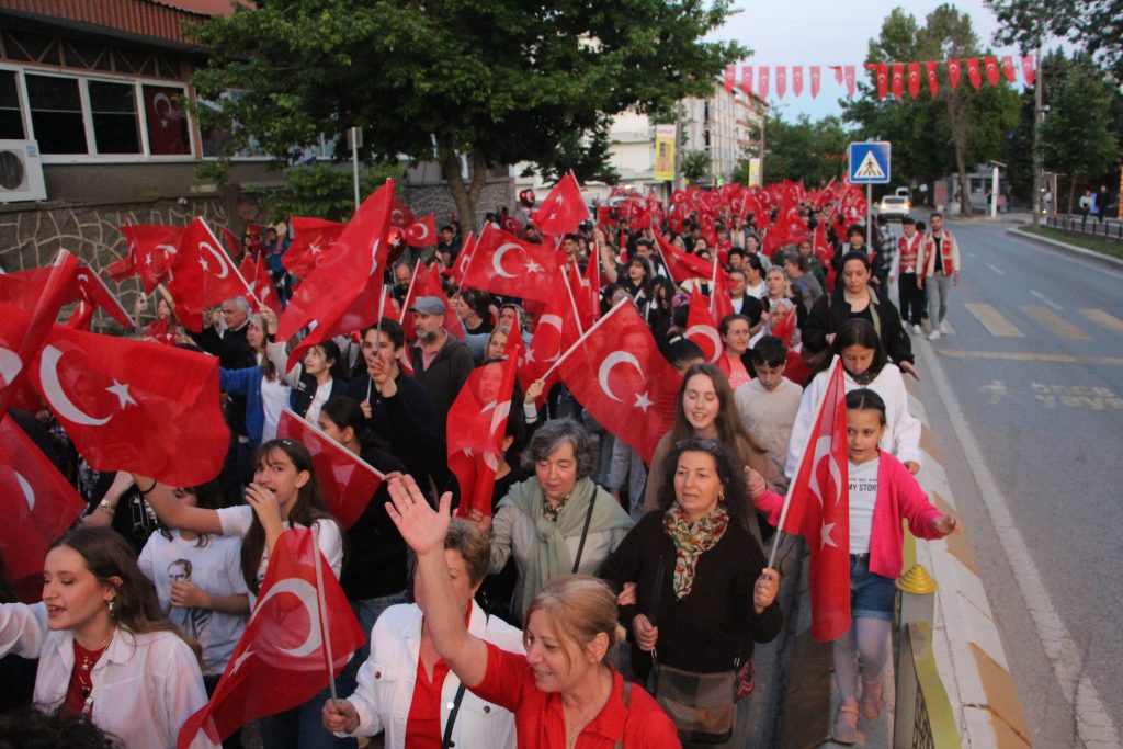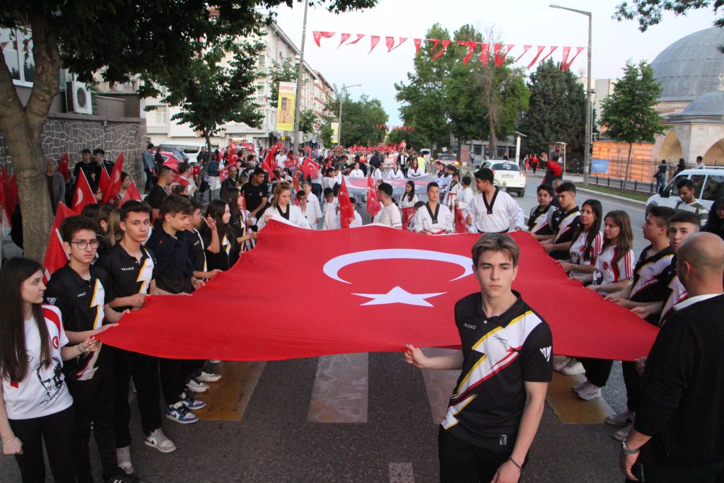 Vatandaşlar da evlerinden bayrak sallayarak korteje destek verdi. Yürüyüş Selimiye Camii Meydanı’nda yapılan meşale gösterisiyle son buldu.