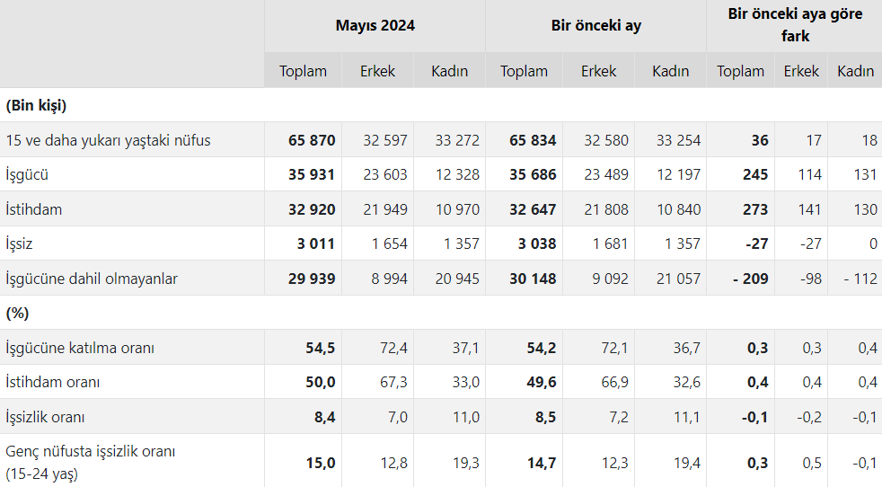 Türkiye İstatistik Kurumu (TÜİK) tarafından açıklanan 'Hanehalkı İşgücü Araştırması' sonuçlarına göre; 15 ve daha yukarı yaştaki kişilerde işsiz sayısı 2024 yılı Mayıs ayında bir önceki aya göre 27 bin kişi azalarak 3 milyon 11 bin kişi oldu. İşsizlik oranı ise 0,1 puan azalarak %8,4 seviyesinde gerçekleşti. İşsizlik oranı erkeklerde %7,0 iken kadınlarda %11,0 olarak tahmin edildi.
