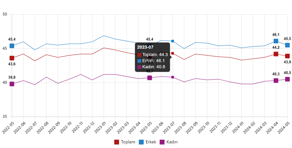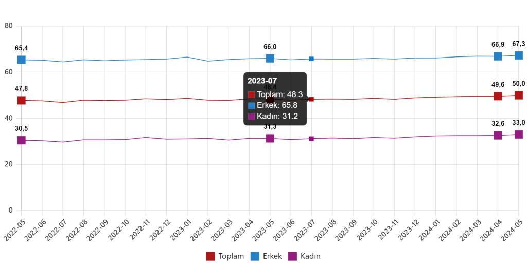 İşgücü 2024 yılı Mayıs ayında bir önceki aya göre 245 bin kişi artarak 35 milyon 931 bin kişi, işgücüne katılma oranı ise 0,3 puan artarak %54,5 olarak gerçekleşti. İşgücüne katılma oranı erkeklerde %72,4 iken kadınlarda %37,1 oldu.