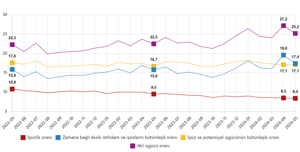 Zamana bağlı eksik istihdam, potansiyel işgücü ve işsizlerden oluşan atıl işgücü oranı 2024 yılı Mayıs ayında bir önceki aya göre 2,0 puan azalarak %25,2 oldu. Zamana bağlı eksik istihdam ve işsizlerin bütünleşik oranı %17,4 iken işsiz ve potansiyel işgücünün bütünleşik oranı %17,1 olarak tahmin edildi.