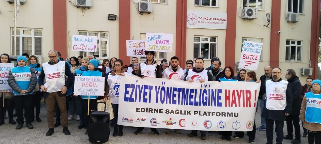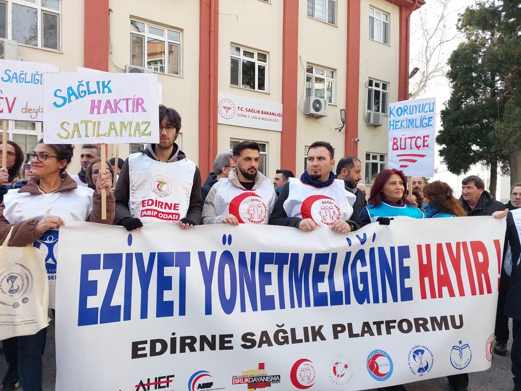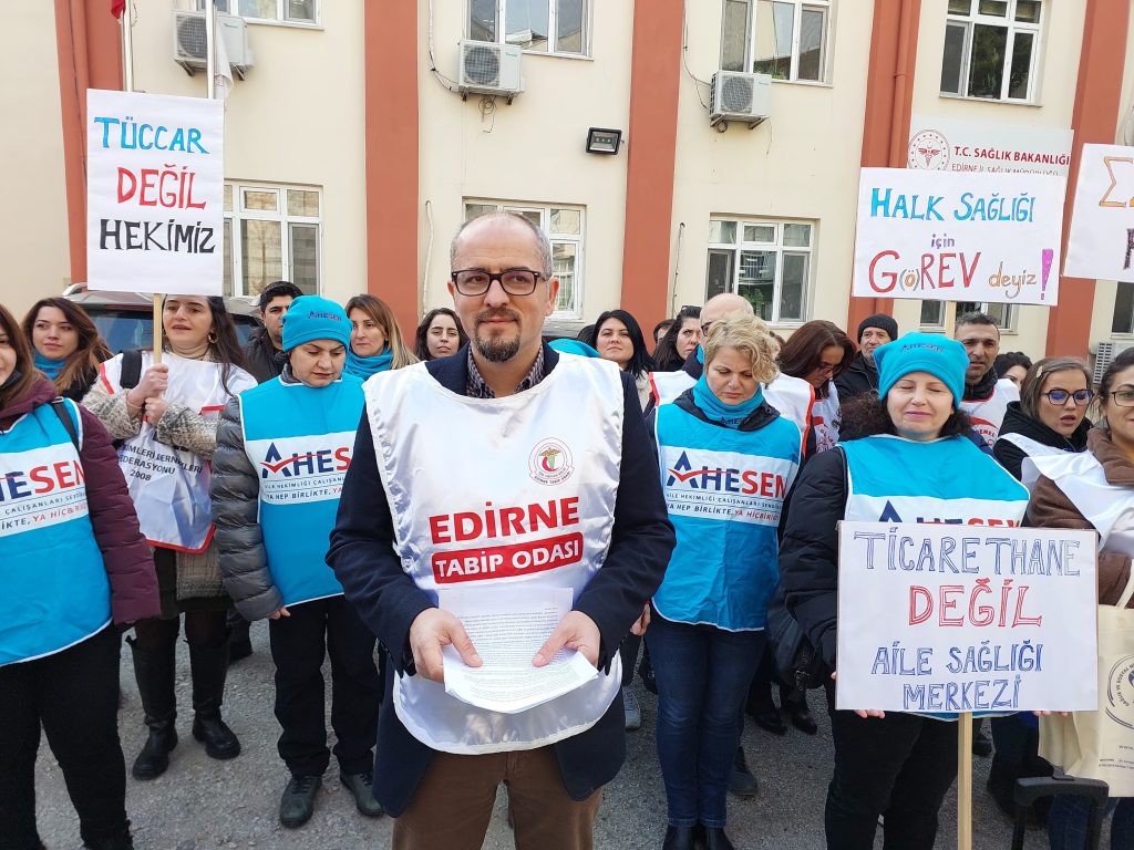 Aile hekimleri tarafından Türkiye genelinde 6-10 Ocak tarihleri arasında iş bırakma eylemi, bugün başlatıldı. Sağlık Bakanlığı’nın hazırladığı performansa dayalı yeni "Aile Hekimliği Ödeme ve Sözleşme Yönetmeliği"ni protesto etmek için 3’üncü kez başlatılan eylem kapsamında, Edirne İl Sağlık Müdürlüğü önünde basın açıklaması gerçekleştirildi. Edirne Aile Hekimleri Derneği Başkanı Dr. Taylan Önal; “Taleplerimiz gerçekleşene kadar çeşitli eylem ve etkinliklerle sağlık otoritesini harekete geçme konusunda zorlamaya devam edeceğimizi, sonuç alıncaya kadar vazgeçmeyeceğimizi tüm kamuoyuna bildiriyoruz” dedi.