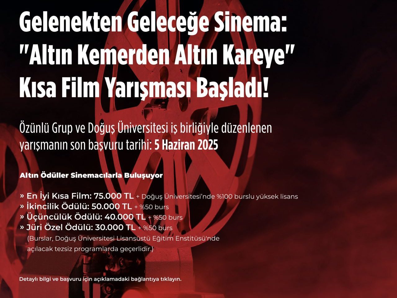 Özünlü Grup ve Doğuş Üniversitesi, Türk sinemasına yepyeni bir vizyon katacak, anlamlı bir kısa film yarışmasına imza atıyor. "Altın Kemerden Altın Kareye" kısa film yarışması, 19 Haziran 2025'te Doğuş Üniversitesi'nin ev sahipliğinde düzenlenecek bu özel etkinlik, kültürel mirasımızın zenginliğini geleceğin sinemacılarının gözünden keşfetmeyi vaat ediyor.