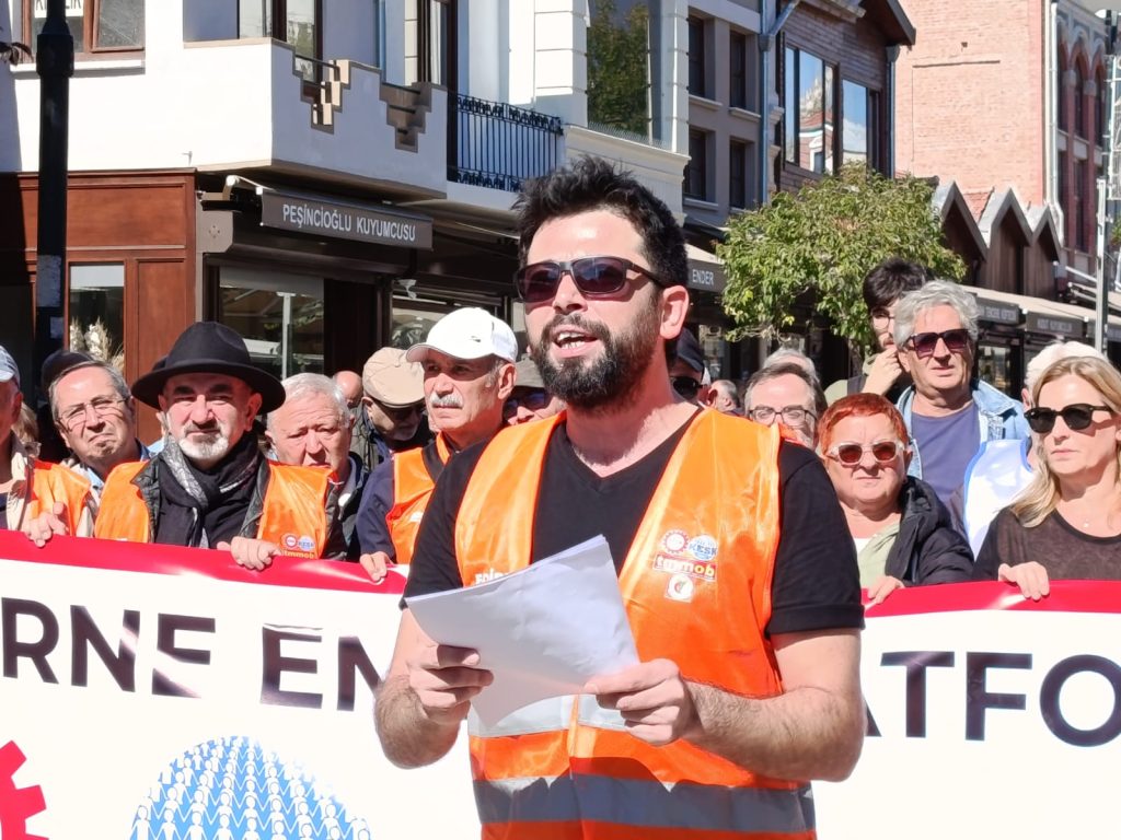 Platform adına basın açıklamasını yapan Edirne Tabip Odası Yönetim Kurulu Üyesi Utku Okçu, “10 Ekim 2015’te Ankara Garı önünde gerçekleşen katliamın 10. yıldönümünde, kaybettiğimiz bütün arkadaşlarımızı saygı ve özlemle anıyoruz. Bundan 10 yıl önce, ülkemizin içinden geçtiği şiddet ve çatışma ortamının sona erdirilmesi için DİSK, KESK, TMMOB ve TTB’nin çağrısı üzerine; ‘Savaşa inat, barış hemen şimdi’ şiarıyla ve Türkiye’nin dört bir yanından gelen on binlerce kişinin katılımıyla gerçekleşen Emek, Barış ve Demokrasi Mitingimize, savaştan beslenen karanlık odaklar korkunç bir katliamla cevap verdiler. Yüreği insan sevgisi ve barış özlemiyle dolu 104 arkadaşımız yaşamını yitirdi. Yaklaşık 500 arkadaşımız yaralandı ve halen çok sayıda arkadaşımız organ kayıplarına rağmen hayatlarını devam ettirmeye çalışıyor. Yaşanan bu büyük katliamın acısı yüreklerimizi yakmaya devam ediyor. Acımız kadar öfkemiz de tazeliğini koruyor” dedi.