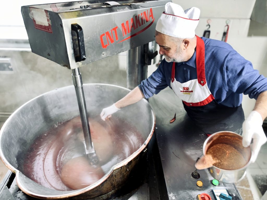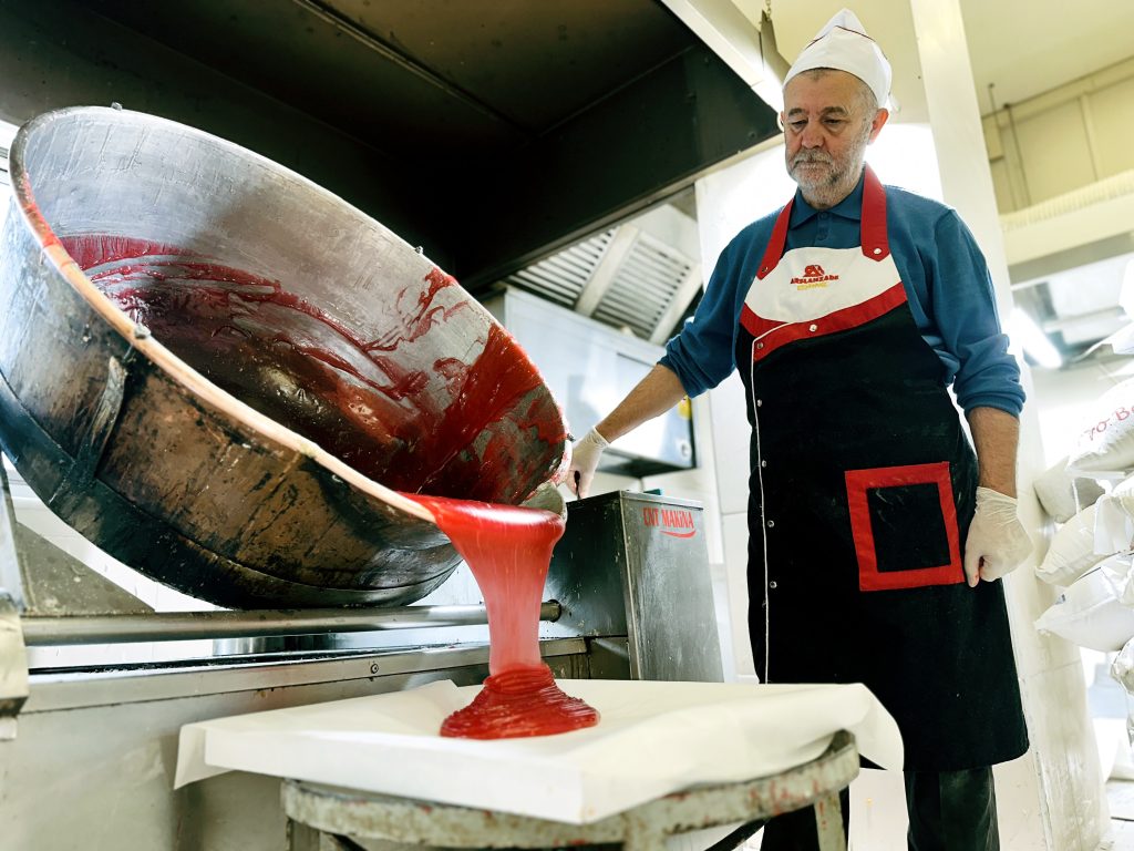 Edirne’nin 67 yaşındaki şekerlemeci ustası Arif Meriç, kentin coğrafi işaretli ünlü tava ciğerinin vazgeçilmez eşlikçisi Karaağaç acı biberini, geleneksel lokumla buluşturarak farklı bir tat ortaya çıkardı. Yaklaşık yarım asırdır şekerlemecilik yapan Meriç, torunlarının önerisiyle başladığı bu denemeyi “Dünya Hali” adını verdiği özel bir ürün haline getirdi.