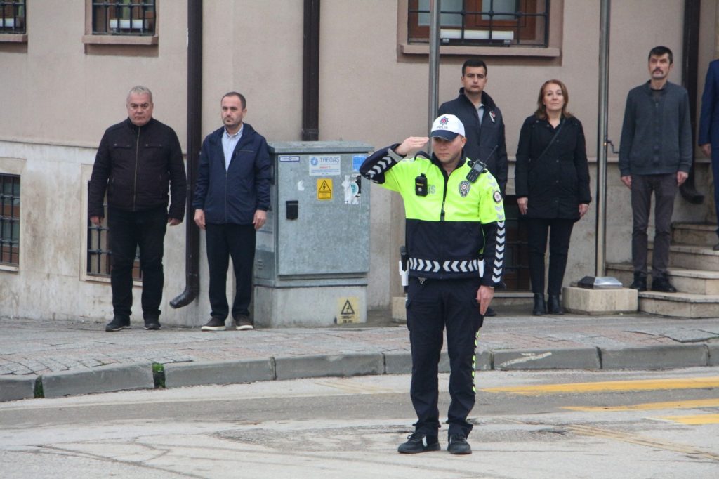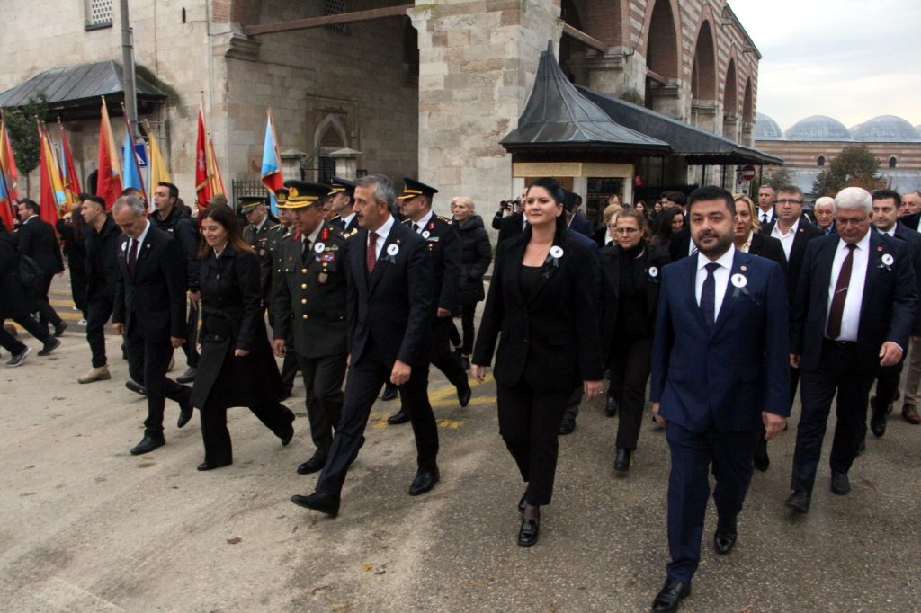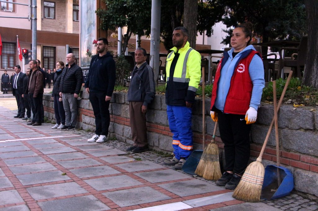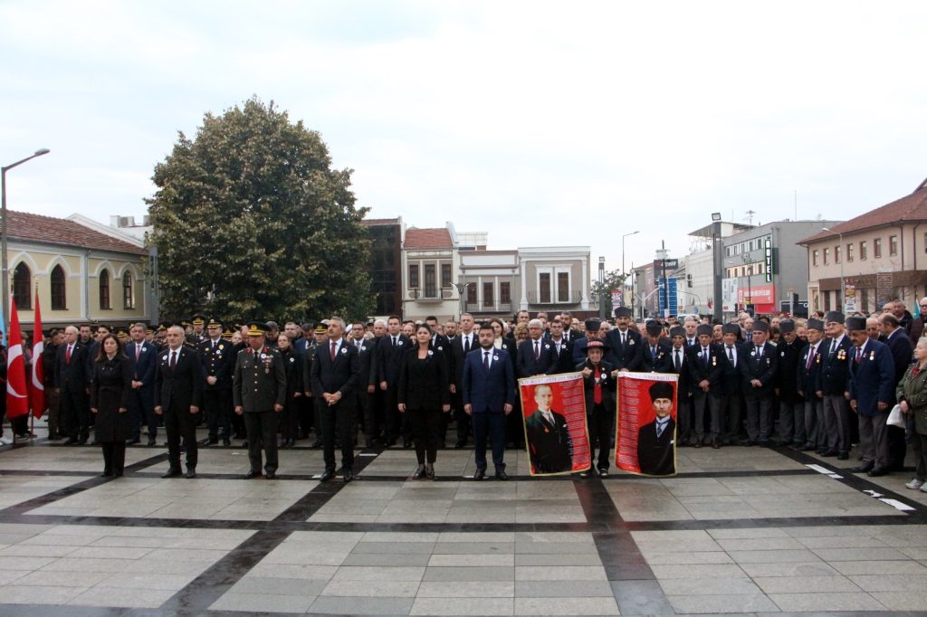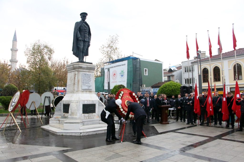 Vali Sezer, Garnizon Komutanı Kolcu ve Belediye Başkanı Gencan ile diğer protokol üyeleri, Atatürk Anıtı’na çelenk sundu. Ardından belediye hoparlörlerinden çalan sirenlerle birlikte tüm kentte iki dakikalık saygı duruşuna geçildi. Sirenler çalarken Edirne sokaklarında sessizlik hâkim oldu. İş yerlerinde çalışanlar, evlerinde bulunanlar ve trafikteki sürücüler, araçlarını durdurarak saygı duruşuna katıldı. Kentin dört bir yanında bayraklar yarıya indirildi.
