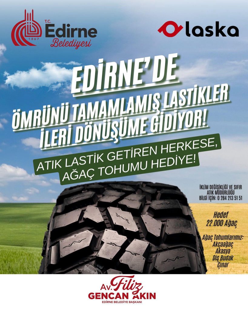 “Ömrünü tamamlamış lastiklerin doğaya zarar vermeden bertaraf edilmesi ve yeniden kullanıma kazandırılması amacıyla, Laska Teknoloji ile önemli bir iş birliği protokolü imzaladık. Bu iş birliğiyle hem çevre kirliliğinin önüne geçiyor hem de geri dönüşümün gücünü Edirne’miz için harekete geçiriyoruz. Atık lastiklerini teslim eden vatandaşlarımıza ağaç tohumu hediyemiz olacaktır.”
