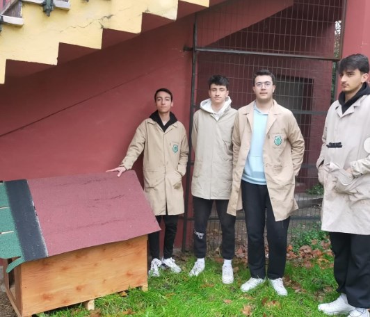 Edirne Mesleki ve Teknik Anadolu Lisesi öğrencileri geri dönüşüm malzemelerini kullanarak okul bahçesinde baktıkları Badi isimli köpeğe kulübe yaptılar.