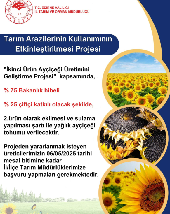 Edirne İl Tarım ve Orman Müdürlüğü, "İkinci Ürün Ayçiçeği Üretimini Geliştirme Projesi" kapsamında, proje bütçesi doğrultusunda yaklaşık 5 bin dekarlık alanda uygulanmak üzere, yüzde 75 bakanlık hibeli, yüzde 25 çiftçi katkılı olacak şekilde, ayçiçeğinin ikinci ürün olarak ekilmesi ve sulama yapılması şartıyla, üreticiye yağlık ayçiçeği tohumu verileceğini duyurdu.