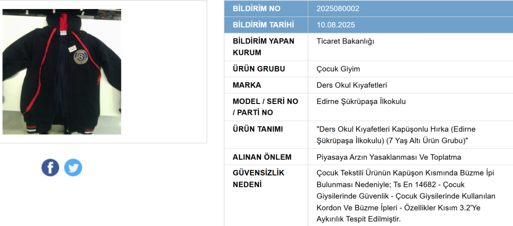 Ticaret Bakanlığı, tüketici güvenliği kapsamında yürüttüğü denetimlerde, çocuk giyiminde güvenlik riski taşıyan bazı okul kıyafetlerini yasakladı. Güvensiz ürün bilgi sistemi üzerinden yayımlanan listede, Edirne Şükrüpaşa İlkokulu’na ait kapüşonlu polar hırka da yer aldı.