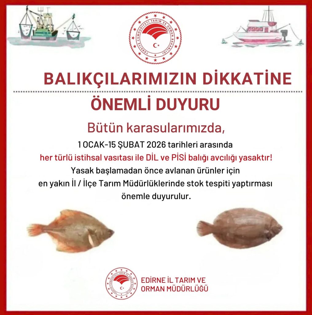 Edirne İl Tarım ve Orman Müdürlüğü, dil ve pisi balığı avcılığının 1 Ocak–15 Şubat 2026 tarihleri arasında tüm karasularda yasaklandığını duyurarak, yasağın başlamasından önce avlanan ürünler için stok tespiti yapılmasının zorunlu olduğunu hatırlattı.