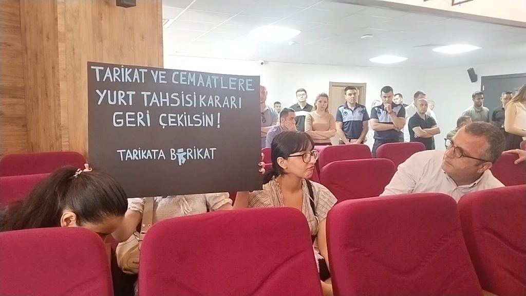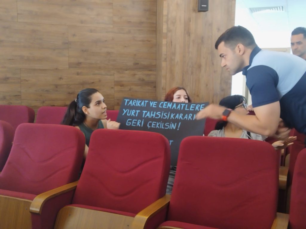 Toplantı öncesinde belediye binası önünde bir araya gelen öğrenciler, Edirne’de 1055 metrekarelik arsanın Nur Cemaati’ne bağlı Hayrat Uluslararası Derneği’ne verilmesi üzerine “Tarikat ve Cemaatlere Yurt Tahsis Kararı Geri Çekilsin – Tarikata Barikat” yazılı pankart açtı. Güvenlik görevlileri müdahale ederek öğrencileri pankartı kaldırmaları konusunda uyardı.