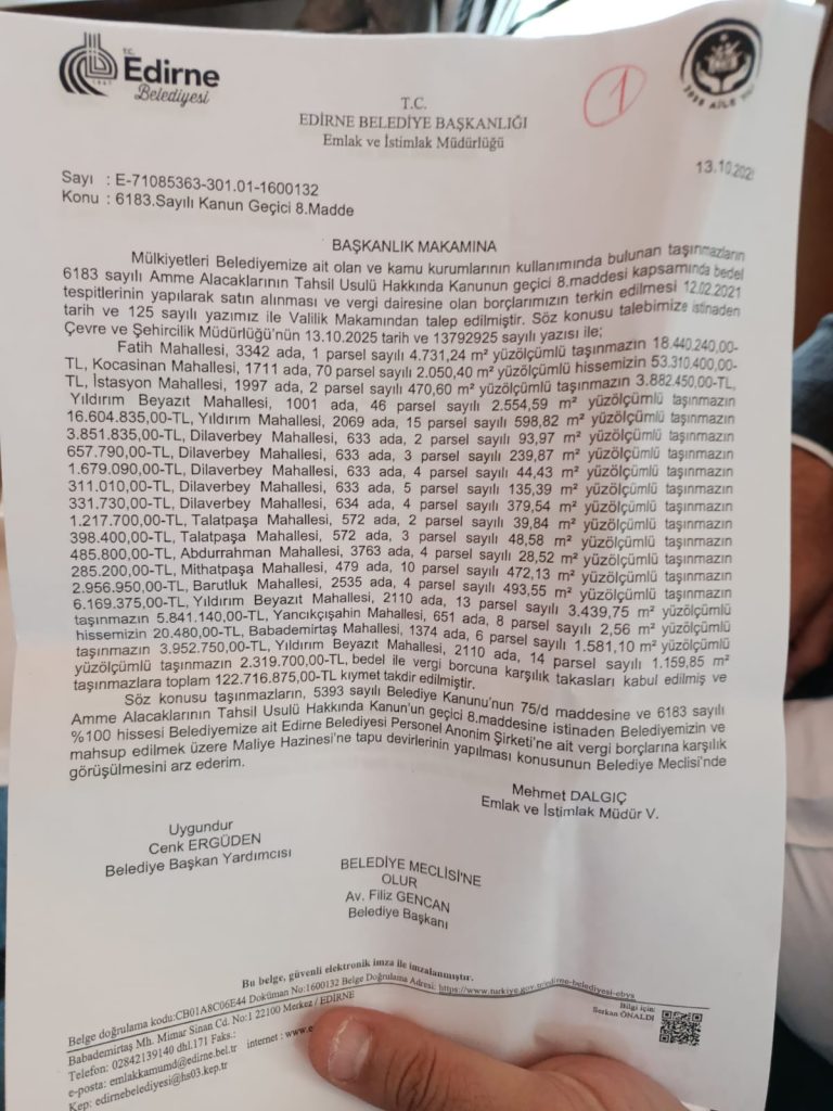 Edirne Belediyesi, vergi borçlarını kapatmak amacıyla toplam 122 milyon 716 bin 875 TL değerindeki 19 taşınmazını Maliye Hazinesi’ne devretti. Başkan Filiz Gencan, “Hem borç hem faiz yükümüzden kurtulduk, Edirnelilere daha nitelikli hizmet sunacağız. Bu vergi borcumuzun silinmesiyle beraber Avrupa Birliği projelerinden daha kolaylıkla faydalanabiliyoruz. Bunun dışında, yapacağımız tüm işlemlerde de bizim için daha olumlu bir tablo ortaya çıkıyor” dedi.