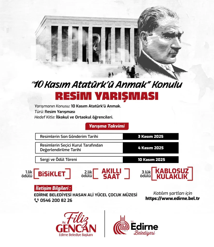 Edirne Belediyesi, Türkiye Cumhuriyeti’nin kurucusu Büyük Önder Mustafa Kemal Atatürk’ü vefatının 87. yıl dönümünde anmak amacıyla, “10 Kasım Atatürk'ü Anmak” temalı bir resim yarışması düzenliyor. Yarışma, İlkokul ve Ortaokul öğrencilerini hedefliyor.
