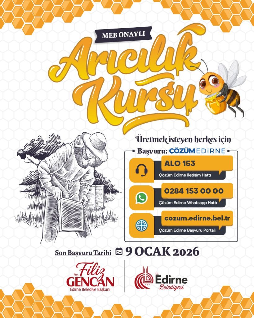 Edirne Belediyesi, arıcılıkla ilgilenen ve üretmek isteyen tüm vatandaşları kursa başvurmaya davet ederken, son başvuru tarihinin 9 Ocak 2026 olduğu hatırlatıldı.