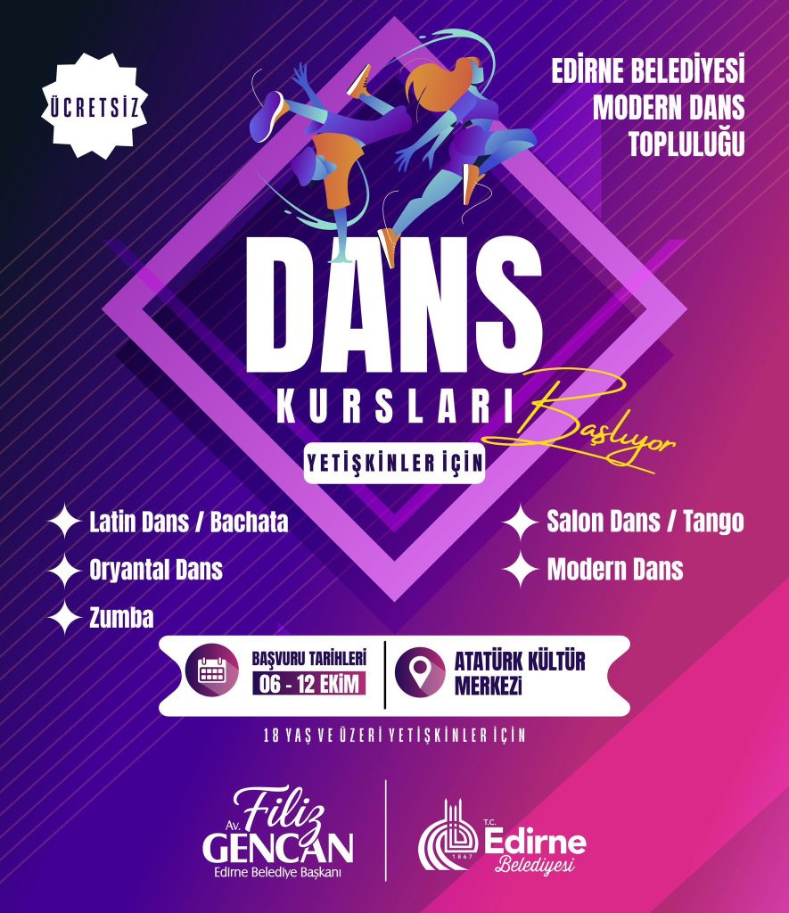 Edirne Belediyesi, 7 yaşından yetişkinlere kadar tüm yaş gruplarına yönelik ücretsiz modern dans ve çeşitli dans kurslarıyla yeni dönemi başlatıyor. Başvurular 06-12 Ekim tarihleri arasında Atatürk Kültür Merkezi ve Belediye Konservatuvarı’nda yapılacak.