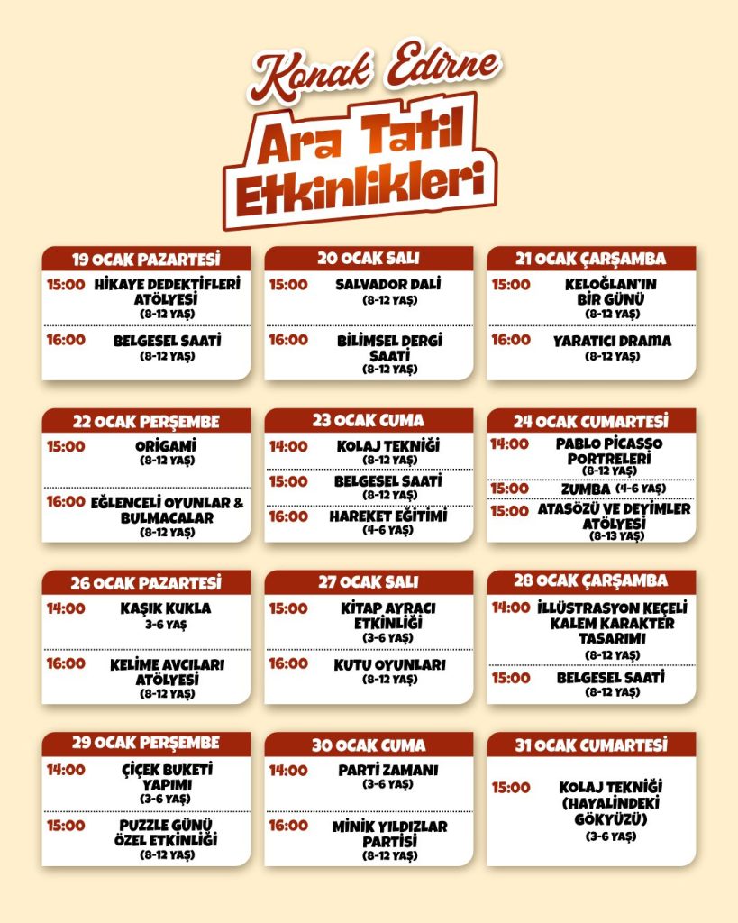 Konak Edirne’de düzenlenecek olan etkinliklere tüm öğrencileri davet eden Edirne Belediyesi; “Ara tatil Konak Edirne’de çok eğlenceli! Oyun, sanat, bilim, müzik ve birbirinden renkli atölyelerle dolu Ara Tatil Etkinlikleri başlıyor. Çocuklarımız hem eğlenecek hem öğrenecek, hayal güçlerini keşfedecek. Tatil boyunca her gün farklı etkinliklerle Konak Edirne minik misafirlerini bekliyor” ifadelerine yer verdi.