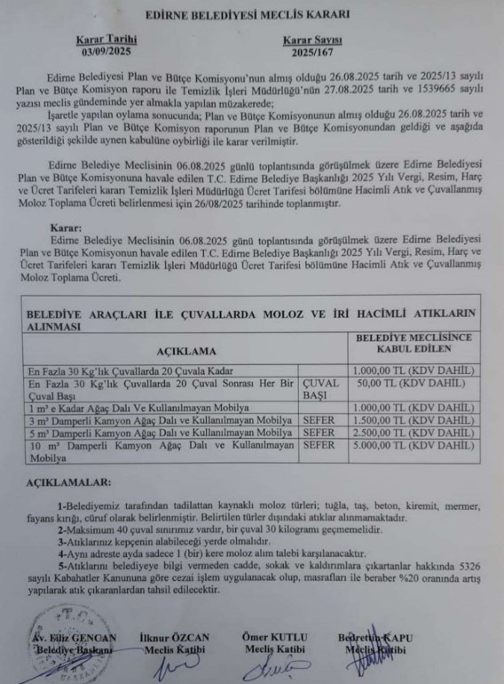 Edirne Belediyesi, şehir genelinde çevre temizliğini artırmak ve atık yönetimini düzenli hale getirmek amacıyla tadilat atıkları, mobilyalar ve bahçe atıkları gibi hacimli atıklar için yeni bir toplama programı başlattı. Bu hizmet, belediye meclisi tarafından belirlenen ücret tarifesi üzerinden gerçekleştirilecek olup toplanan atıklar bertaraf tesislerine nakledilecektir.