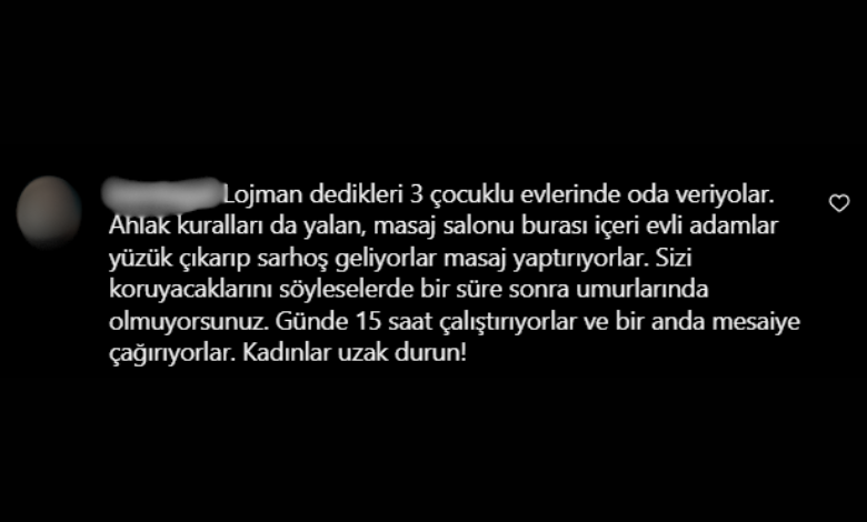 Sosyal medya üzerinden tepkisini dile getiren bir vatandaş; "Lojman dedikleri 3 çocuklu bir evde oda veriyorlar. Ahlak kuralları da yalan, masaj salonu burası. İçeri evli adamlar yüzük çıkarıp sarhoş geliyorlar masaj yaptırıyorlar. Sizi koruyacaklarını söyleseler de bir süre sonra umurlarında olmuyorsunuz. Günde 15 saat çalıştırıyorlar ve bir anda mesaiye çağırıyorlar. Kadınlar uzak durun!" ifadelerini kullandı.