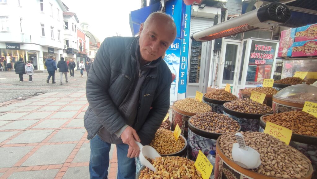 Eskiden tonla sattıkları ürünleri, artık vatandaşların gramla aldığına dikkat çeken Şaban Durak; “Fiyatlar şu anda uçtu. Yerli vatandaş alamıyor. Bu yılbaşında, galiba yerli vatandaşımız kuruyemiş yiyemeyecek. Eskiye göre satışlar düşük. Eskiden bu zamanlar tonlarca mal satardık. Eskiden kabuklu kuruyemiş satardık, şimdi hiç kabuklu yok, neredeyse hiç kabuklu ürün yok. Bir yılbaşında, en azından 1 ton kabuklu kuruyemiş satardık, 1-2 ton kestane satardık. Şu anda gram gram alıyorlar. Yerli vatandaş hiç alamıyor, Bulgar’lar alıyor” dedi.