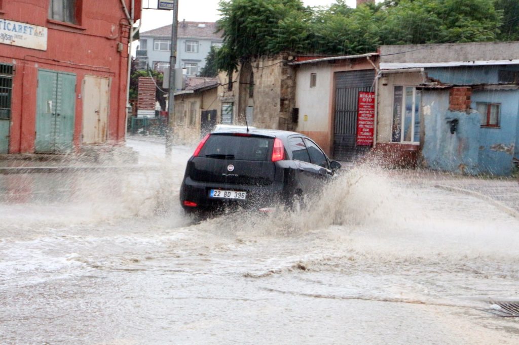 Edirne’de 35 dereceyi bulan sıcaklığın ardından akşam saatlerinde aniden bastıran sağanak yağış, hava sıcaklığını 29 dereceye düşürerek serinlik getirdi; yağışa hazırlıksız yakalanan vatandaşlar dükkanlara ve saçak altlarına sığındı. Kent genelindeki bazı noktalarda oluşan su birikintileri ise sürücülere zor anlar yaşattı.