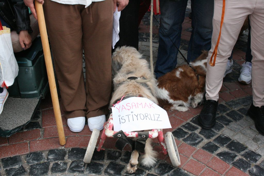 Konuşmanın ardından sloganlarla devam eden eyleme, bir vatandaş çuvalla getirdiği köpek mamasıyla katıldı. Yem çuvalını katılımcıların ortasına bırakan vatandaş, hayvanların öldürülmesine müsaade etmeyeceklerine vurgu yaptı.