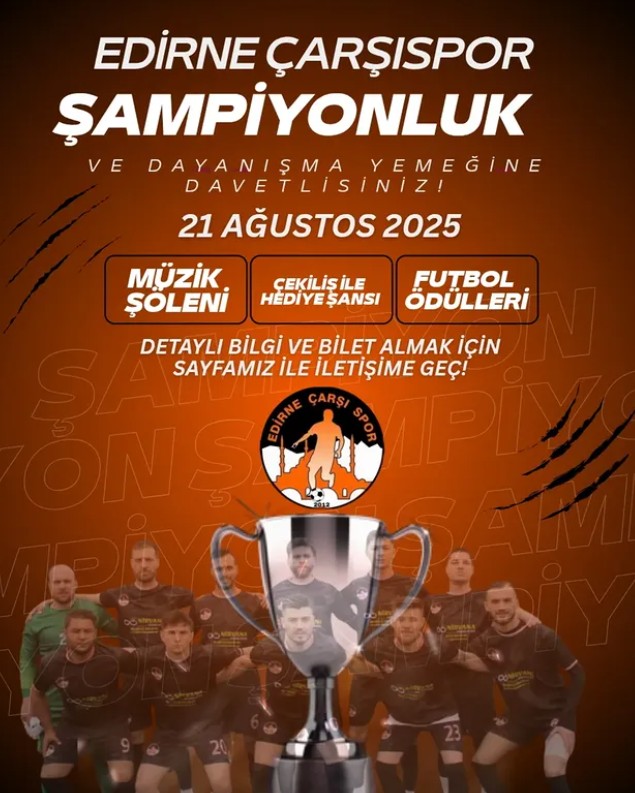 Edirne'de 1'inci Amatör Lig'de A Grubu’nda 2024-2025 sezonunu ikinci sırada tamamlayarak Süper Amatör Lig’e yükselen Edirne Çarşı Spor, bu büyük başarıyı camiayla birlikte kutlamaya hazırlanıyor. Kulüp, 21 Ağustos Perşembe akşamı saat 20.00’de Bizim Bahçe Düğün Salonu’nda “Şampiyonluk, Yardımlaşma ve Dayanışma” temasıyla özel bir gece düzenleyecek.