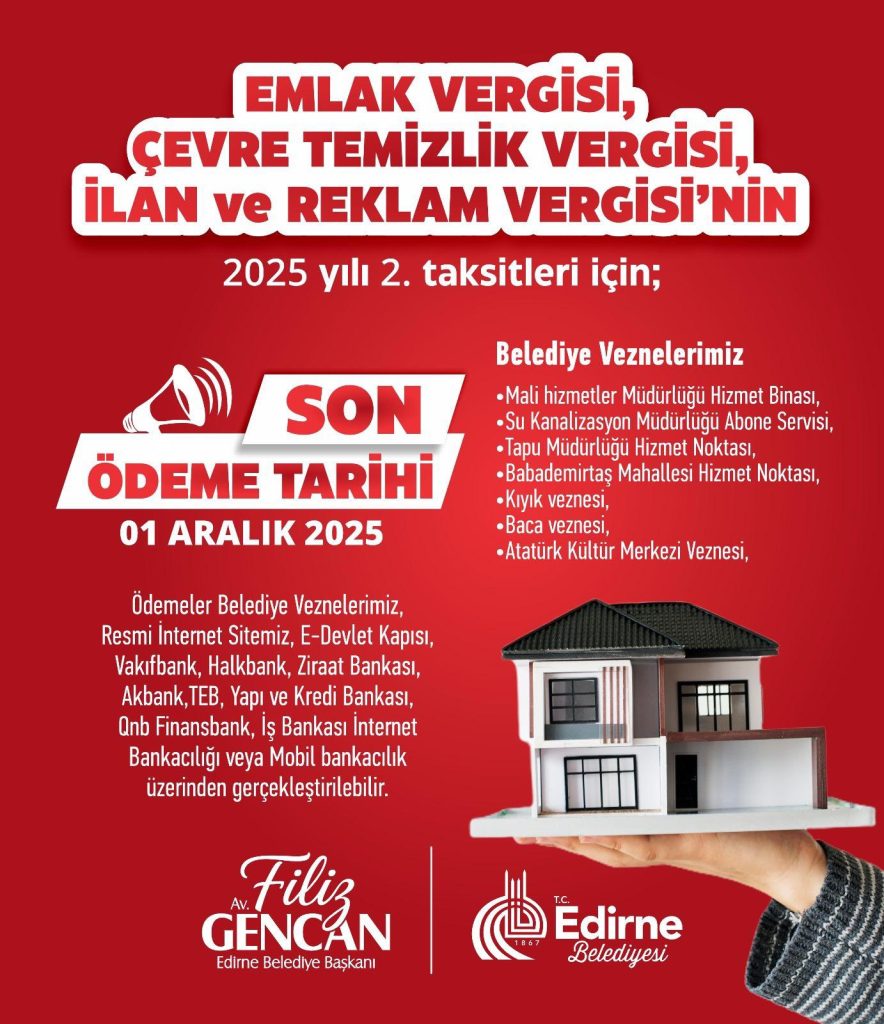 Duyuru yapan Edirne Belediyesi; “Emlak Vergisi, Çevre Temizlik Vergisi ile İlan ve Reklam Vergisi’nin 2025 yılı 2. taksit ödemelerinde son gün 1 Aralık 2025. Ödemelerinizi belediye veznelerimizden, resmî internet sitemizden veya e-Devlet üzerinden kolayca yapabilirsiniz. Unutmayalım; süresinde yapılan her ödeme, şehrimizin hizmetlerine katkı demektir” ifadelerine yer verdi. Haber Merkezi