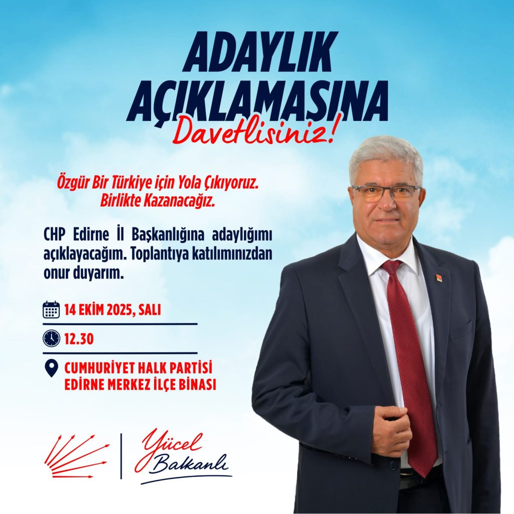 Cumhuriyet Halk Partisi (CHP) önceki dönem Edirne Merkez İlçe Başkanı Yücel Balkanlı, yarın saat 12.30'da düzenlenecek etkinlikle, parti binasında Merkez İlçe Başkanlığı binasında İl Başkanlığı'na adaylığını açıklayacak.