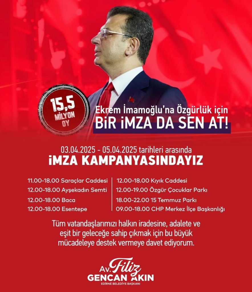 CHP Genel Merkezi tarafından, Marmara Cezaevi’nde tutuklu bulunan İBB Başkanı ve CHP Cumhurbaşkanı Adayı Ekrem İmamoğlu’nun serbest bırakılması ve erken seçim sandığının kurulması talebiyle imza kampanyası başlatıldı. Türkiye genelinde yaklaşık 28 milyon imza hedefiyle yola çıkılan kampanya kapsamında, Edirne’de 3-5 Nisan tarihleri arasında 8 noktada imza standı kurulacak.
