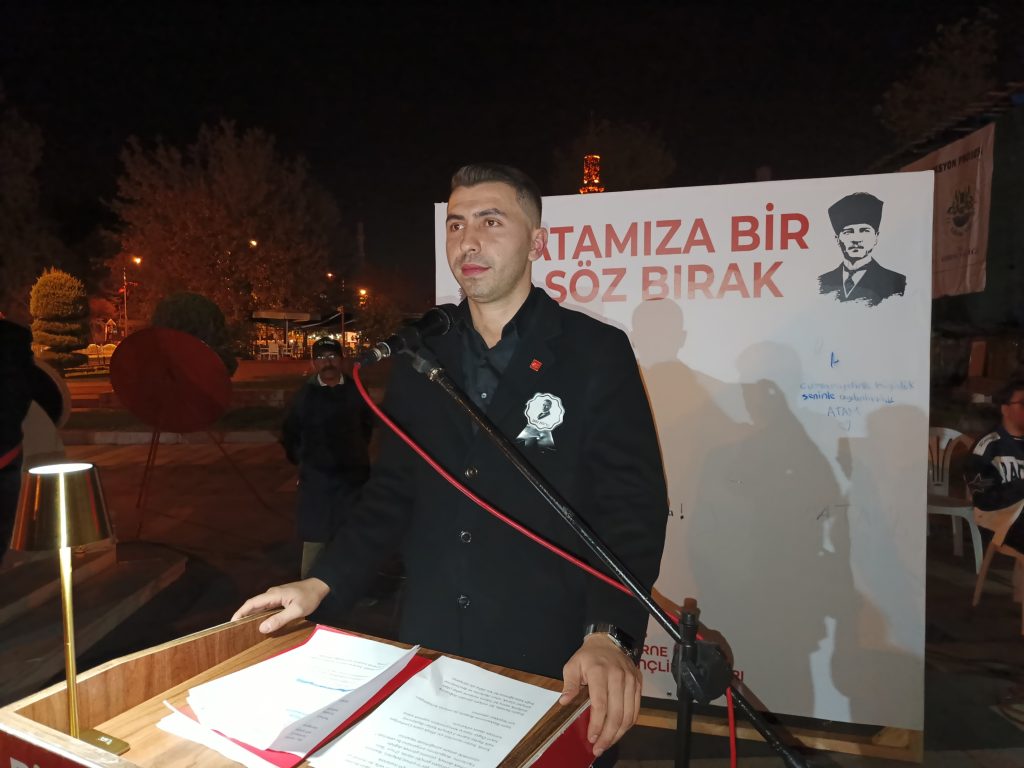 Törende konuşan CHP Edirne İl Gençlik Kolları Başkanı Özgür Hata, Atatürk’e olan sevgi, saygı ve bağlılığın sadece bir anma günüyle sınırlı olmadığını belirterek, “Bugün burada, büyük bir özlemin, büyük bir sevdanın ve aynı zamanda büyük bir sorumluluğun bilinciyle toplandık. Yarın, 10 Kasım sabahı saat dokuzu beş geçe milletçe bir kez daha Atamıza duyduğumuz sonsuz minneti, sevgiyi ve saygıyı göstereceğiz. Ama biz bu akşam bir ulusun kalp atışını hissetmek, Atamıza olan bağlılığımızı göstermek için buradayız. Bu nöbet sadece bir bekleyiş değil; bir duruş, bir inançtır. Bugün burada, bizden önceki kuşakların biz gençlere emanet ettiği Cumhuriyeti, bizden sonraki genç kuşaklara aynı kararlılıkla ve inançla devretmeye söz veriyoruz” ifadelerini kullandı.